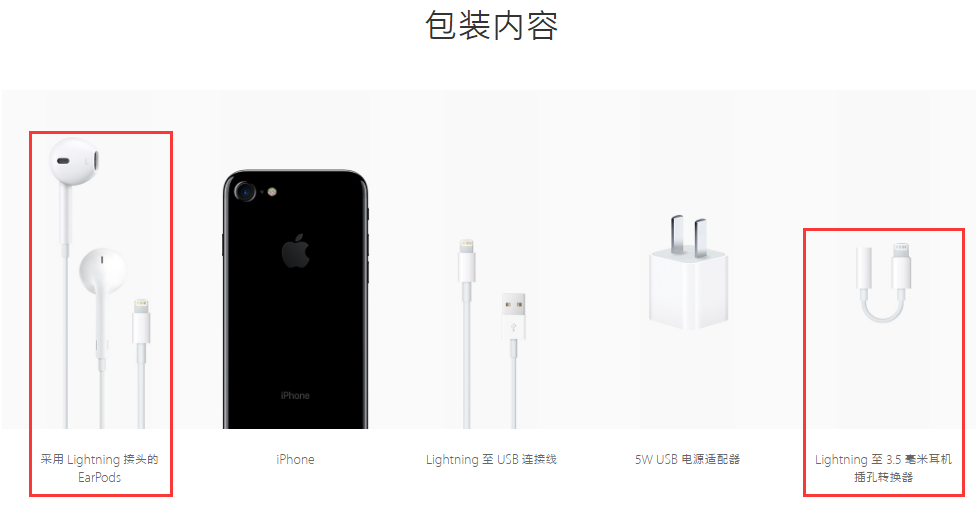 苹果官网上显示的iPhone7标配,内含Lighting接口耳机和转换头。