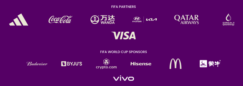 据国际足联公开资料显示:世界杯赞助商分为四类,依次排列分别是一级赞助商“国际足联合作伙伴FIFA Partners”、二级赞助商“世界杯赞助商FIFA World Cup Sponsors”、三级赞助商“区域赞助商FIFA Regional Supporters”。