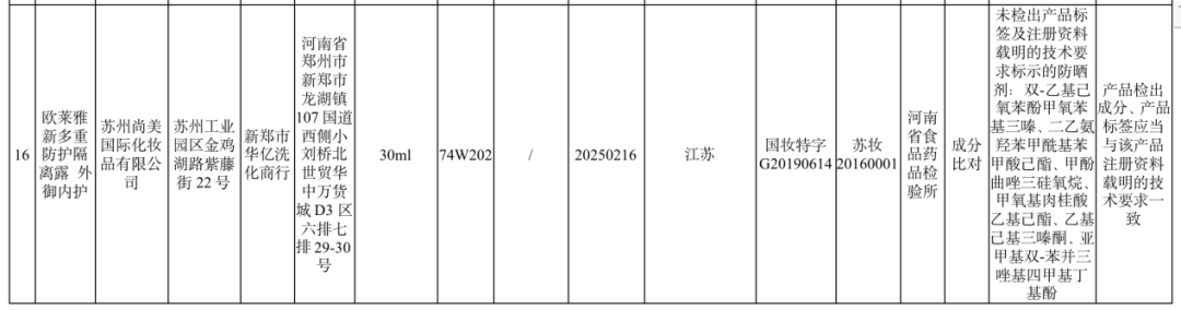 值得关注的是,国际美妆巨头欧莱雅旗下巴黎欧莱雅也有一单品上榜。由苏州尚美国际化妆品有限公司进行生产、备案的欧莱雅新多重防护隔离露,在成分比对中,未检出产品标签及注册资料载明的技术要求标示的防晒剂:双-乙基己氧苯酚甲氧苯基三嗪、二乙氨羟苯甲酰基苯甲酸己酯等六种成分。