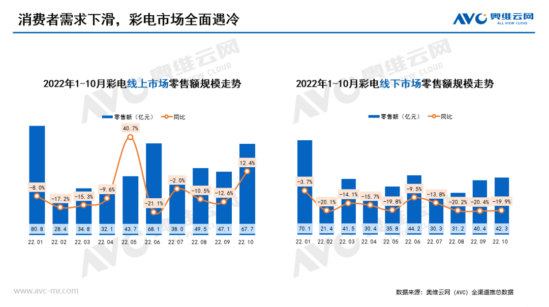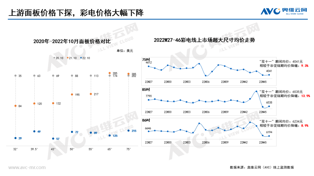 近年来中国彩电市场已经步入存量时代,并且由于疫情以及消费需求不足等因素的影响,使得彩电市场规模增长更为乏力,彩电行业发展更加艰难。据奥维云网(AVC)全渠道推总数据,2022年1-10月中国彩电线上市场零售额规模为490亿元,同比下滑6.5%;同期,线下市场零售额规模为388亿元,同比下降14.9%,彩电市场全面遇冷已成定局。今年“双十一”大促同样未见成效,随着面板价格的下降,双11彩电价格已是历史最低价,但仍未拉动彩电线上市场规模的增长。