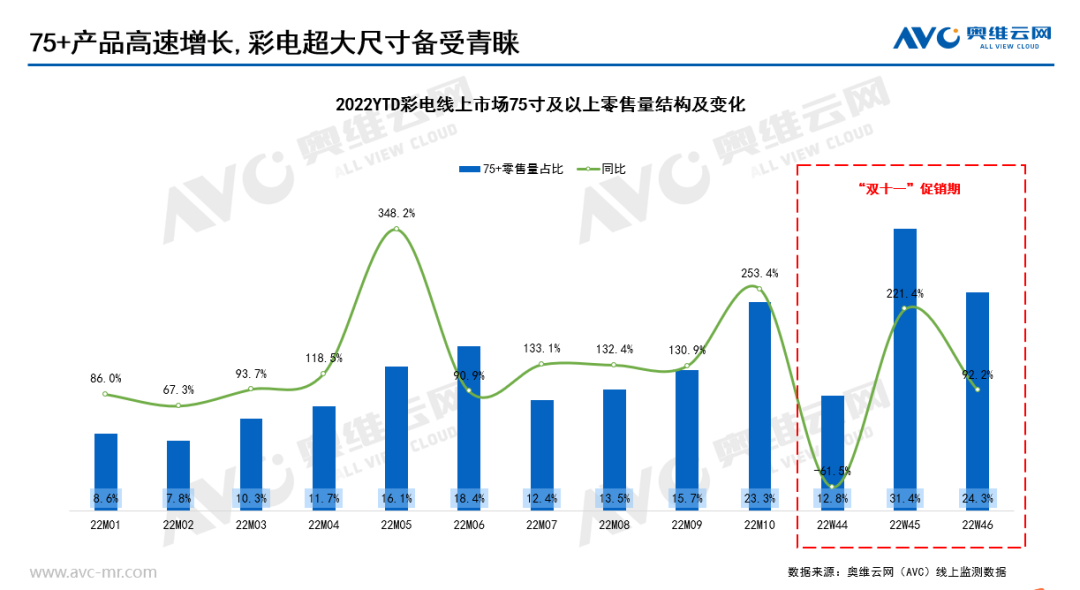 但从尺寸结构上来看,2022年彩电市场的大尺寸已经迈入了快速发展阶段, “75+”产品进入高增长模式,大尺寸的彩电逐渐被消费者所接受,并且进一步成为消费者心中的新宠儿。大尺寸电视同样在“双十一”期间(22W44-22W46)表现亮眼,促销期内第二周呈现爆发式增长,大尺寸电视成为今年大促期间各大企业的主推产品。