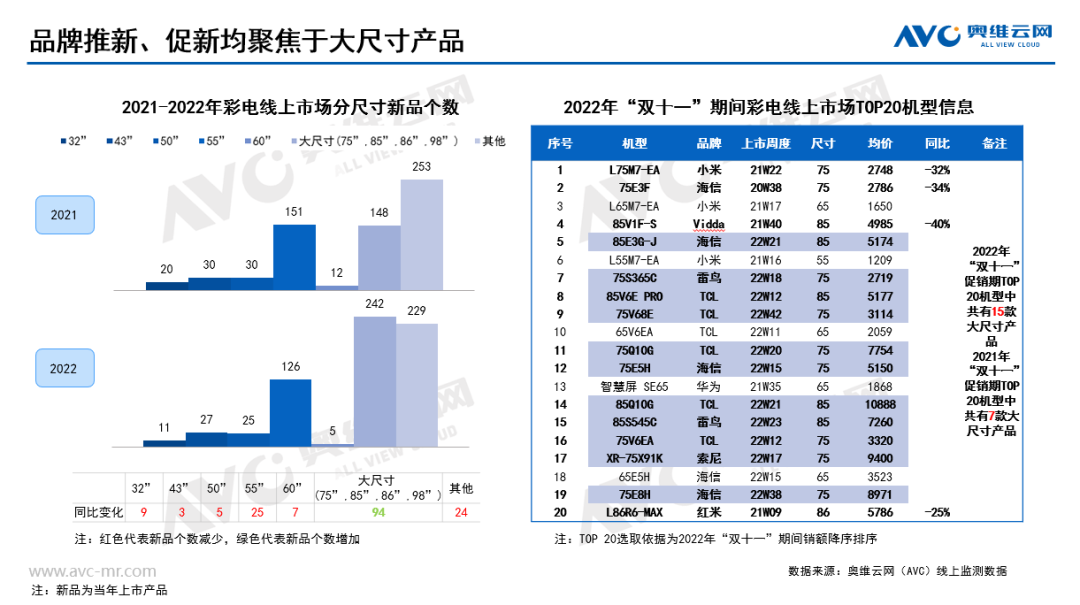 通过2022年“双十一”期间(22W44-22W46)彩电线上市场的热销机型不难看出,消费者对于“大”的偏好尤为明显,彩电线上市场TOP 20机型中,大尺寸产品个数高达15个,占75%。而2021年同期热销的TOP 20机型中,大尺寸产品个数仅占7个。2022年“双十一”期间彩电线上市场的TOP 20机型中,大尺寸产品中有11款是当年上市的新品,其余4款大尺寸产品则是以往年份上市产品,但是通过均价对比可以看出,这4款产品的促销力度非常之大,降价幅度最高达40%。各大品牌不仅在产品上新方面聚焦于大尺寸,而且对大尺寸新品的推广力度也非常之高。