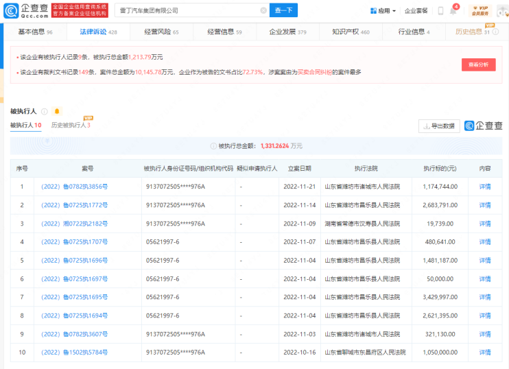 而就在前不久,也即是11月中旬,有媒体报道,雷丁汽车疑似出现资金链问题;且公司在收到经销商货款后长时间未履行发货承诺。据企查查显示,雷丁汽车因未按时履行法律义务被法院强制执行,11月初至今不足一月的时间,公司列为被执行人9次,被执行金额超1200万元,多为买卖合同纠纷案件。