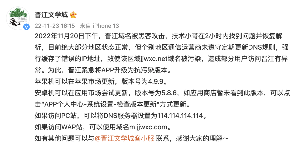 11月23日下午,晋江文学城官博发布公告称,2022年11月20日下午,晋江域名被黑客攻击,技术人员在2小时内找到问题并恢复解析,目前绝大部分地区状态正常,但个别地区通信运营商未遵守定期更新DNS规则,强行缓存了错误的IP地址,致使该区域jjwxc.net域名被污染,造成部分用户访问晋江有异常。为此,晋江紧急将APP升级为抗污染版本。