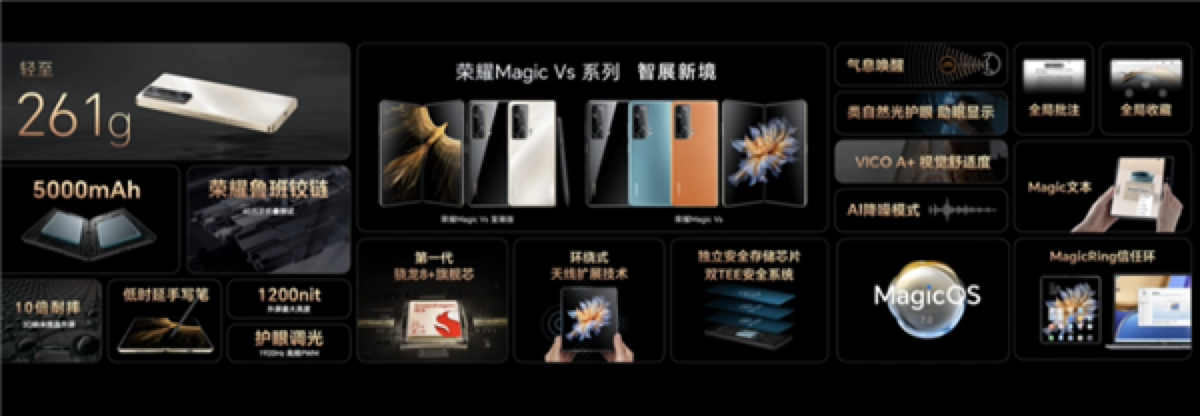 在荣耀 Magic Vs 的配置部分,内部搭载高通骁龙 8+ Gen 1 SoC,同时也搭载荣耀刚刚发布的 MagicOS 7.0 系统,加入了包括 AI 降噪、手机 U 盾支持,类自然光护眼等功能。