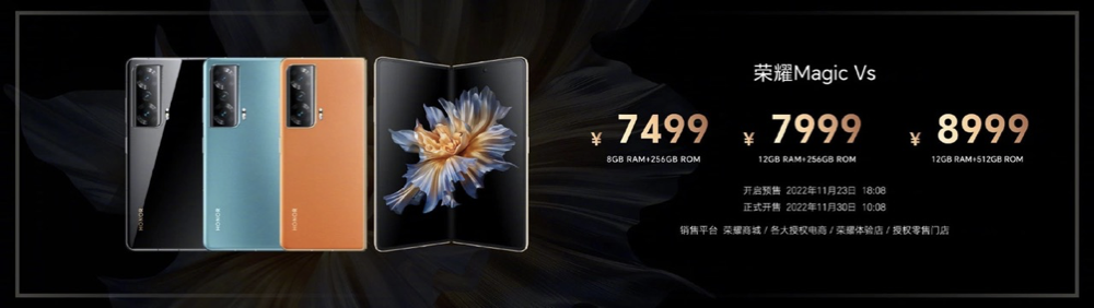 售价方面,荣耀 Magic Vs 起售价 7499 元,至臻版 16GB + 512GB 售价 10888 元,于 11 月 23 日起 18:08 开启预售,11 月 30 日 10:08 正式开售。