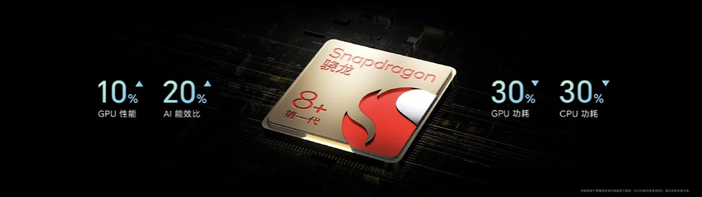 荣耀 80 Pro 搭载高通骁龙 8+ Gen 1 SoC,同时也是首发搭载低频版骁龙 8+ Gen 1 的机型,荣耀在发布会中表示这颗 SoC 相比原版 GPU 性能升级 10%,AI 能效比提升 20%,同时 GPU/CPU 功耗都有大幅降低。