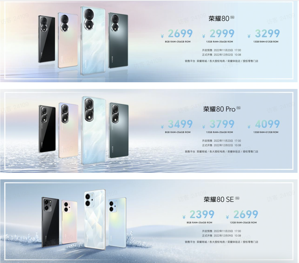 荣耀 80 起售价为 2699 元,荣耀 80 Pro 起售价为 2699 元,荣耀 80 SE 起售价为 2699 元,三款均为11 月 23 日起开启预售,正式开售时间为十二月初。