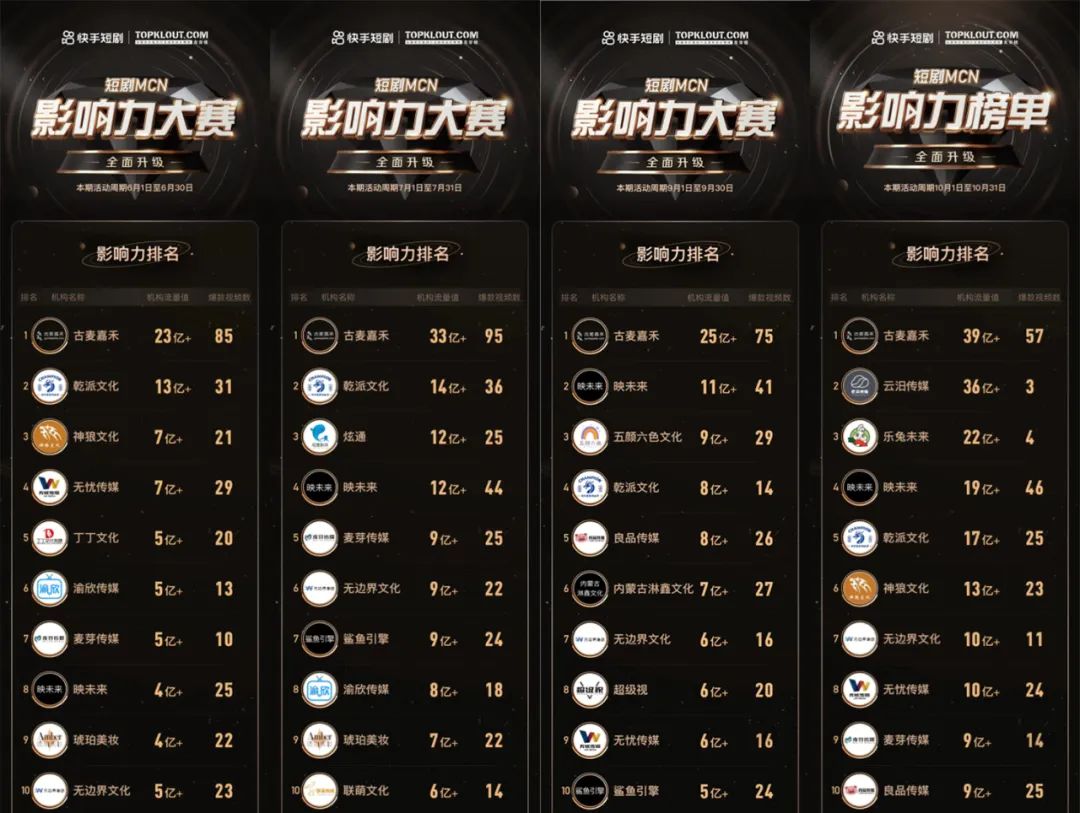 可以结合磁力聚星与TopKlout克劳锐联合发布的“快手短剧MCN影响力大赛”榜单,对近几个月相关公司的生产机构做一观察。