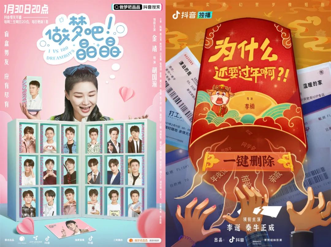 2021年初抖音宣布发力短剧时,推出的就包括金靖和多位男星主演的《做梦吧!晶晶》和秦牛正威、李诞等主演的《为什么还要过年啊》等,并在娱乐白皮书中宣布将与真乐道文化、华谊创星、五元文化、唐人影视等行业头部公司制作30+部精品微短剧。