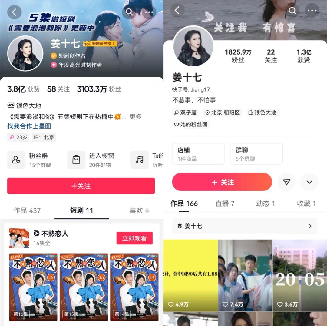 也有部分公司已经和抖音形成了较稳定的合作,比如MCN机构银色大地旗下达人姜十七,在抖音已经成为主要的现实题材短剧产出者,包括《生于1990》《夜班日记》《医生的温度》等;而虽然她在快手也有1825.9万粉丝,但今年以来只更新了5条视频。
