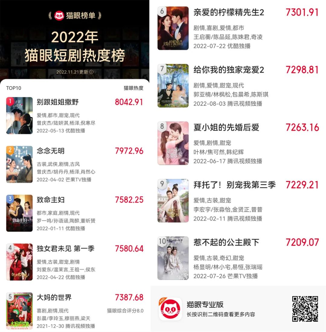 不妨结合猫眼专业版的2022年短剧热度榜,看看相关热门短剧背后的信息。