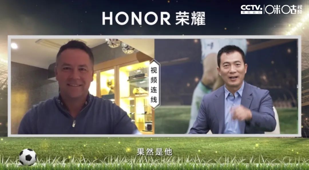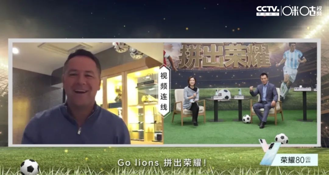 当主持人煞有其事地拿起荣耀手机,接通了嘉宾黄健翔和神秘大咖的视频连线,传奇球星欧文向中国球迷say hi并分享了他关于英格兰队的比赛前瞻,视频结尾欧文与主持人一起喊出了一句“Go lions 拼出荣耀!”