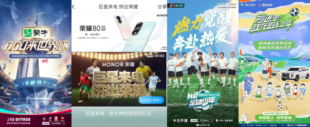 除了咪咕和抖音,版权王者央视频的《世界杯最前沿》也拿到了蒙牛的冠名,快手竖屏微综《传奇请指教》招揽到长虹和美菱两个赞助,腾讯视频主打”少年足球体教陪伴”的长综艺《前进吧!现代足球少年》也得到了现代汽车的冠名支持。