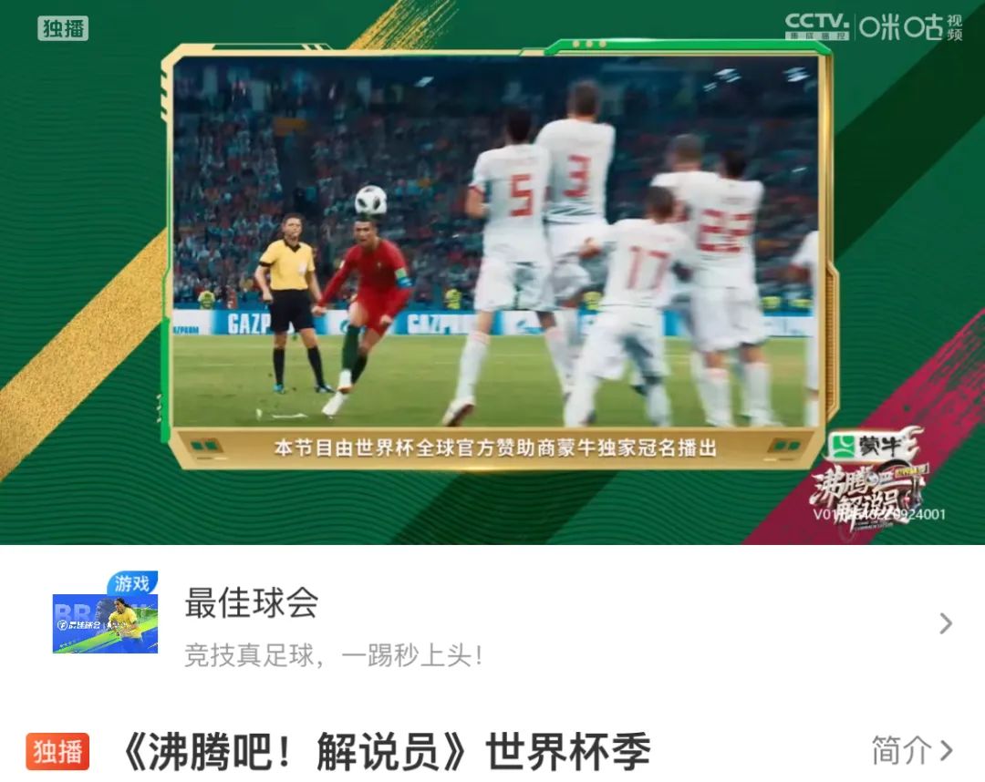 咪咕这边,一个月前预热综艺《沸腾吧!解说员·世界杯季》就谈妥了蒙牛的冠名,很多球迷就是因为该节目得知了蒙牛成为世界杯全球官方赞助商的信息,这家钟爱世界杯营销的乳企也从此开始了与多档综艺的频繁接洽。
