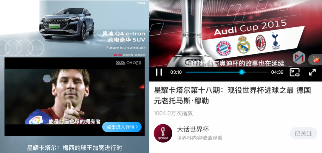而在这档系列微纪录片《星耀卡塔尔》中,一汽奥迪才是真正的营销主角,节目在安利球星时不动声色就把奥迪品牌信息融在旁白里,如介绍托马斯·穆勒时cue到他日常代步汽车就是奥迪,这等巧妙植入真乃化广告于无形。