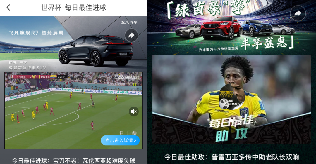 比较夸张的是,咪咕很多比微综还要轻量的小栏目也得到了品牌的青睐,比如飞凡汽车冠名了《世界杯·每日最佳进球》、一汽丰田冠名了《世界杯·每日最佳助攻》,这种小体量赞助彰显出品牌们对于咪咕观赛流量的充分信赖。