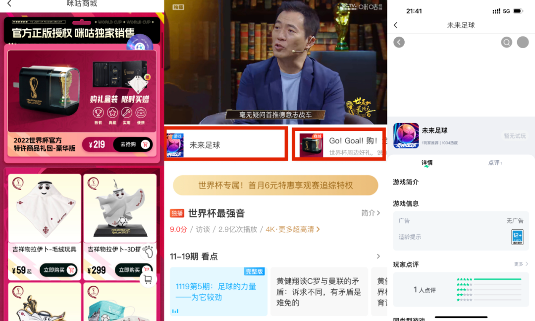 这其中,咪咕视频的营销玩的最花哨,例如在综艺《世界杯最强音》的播放页里,我们可以看到《最佳球会》《未来足球》等游戏广告被嵌入在视频下方左侧,右侧则特别安放有「咪咕商城」的链接,观众可在看节目的空隙跳转去选购3D大力神杯充电器、国家队马克杯等世界杯周边商品。
