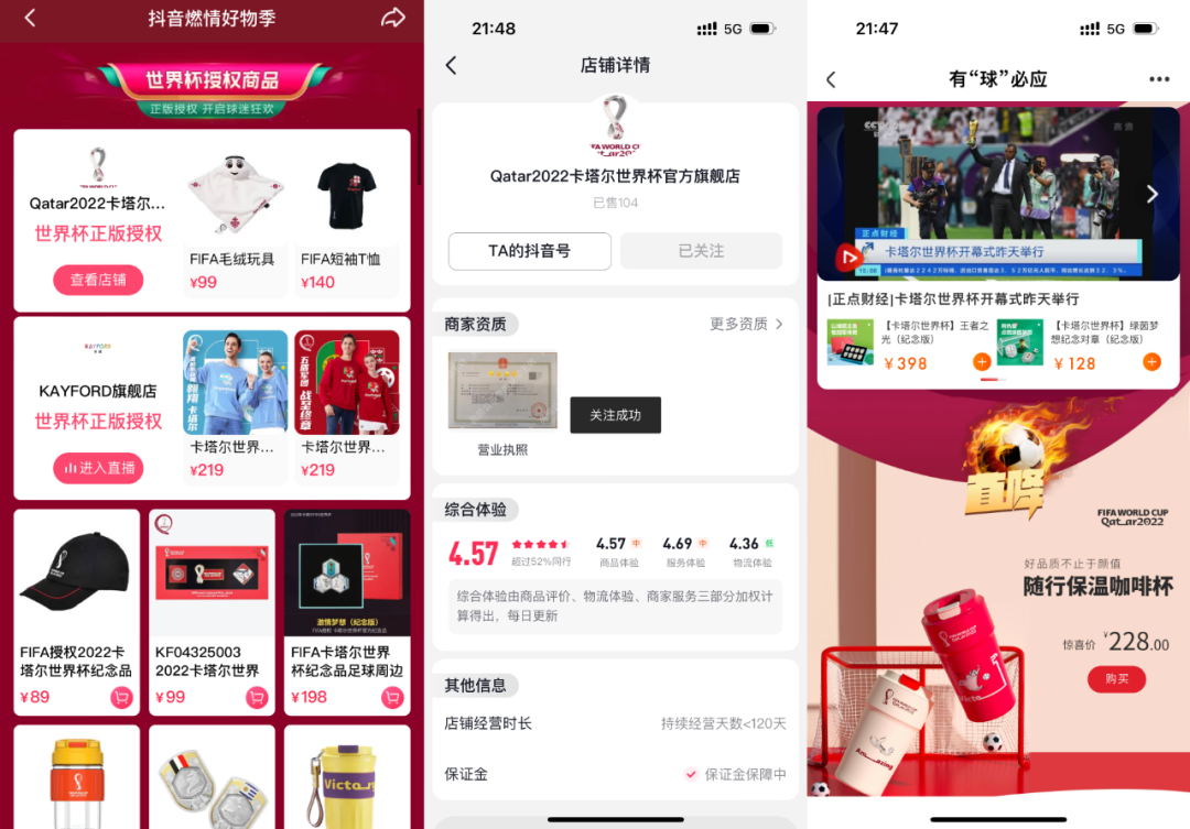 近年不断发力「兴趣电商」的抖音也营销得很猛,《DOU来世界杯》的播放页下方被嵌入了「抖音燃情好物季」的购买链接,而所有观众都可通过该链接去到世界杯官方授权的“卡塔尔世界杯官方旗舰店”等带货直播间完成营销转化。