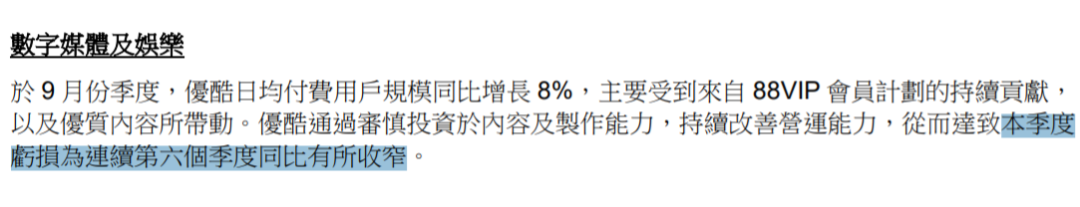 所以从去年底开始,各平台在财报中都在把“亏损收窄”当作一个关键词,阿里三季报中,就提到了优酷本季度亏损“连续第六个季度同比有所收窄”。