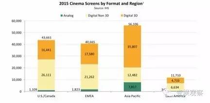 2015年全球范围内的影院银幕总数同比增长8%,增加数量15200张,很大程度上由于亚太地区的增幅达19%所拉动。