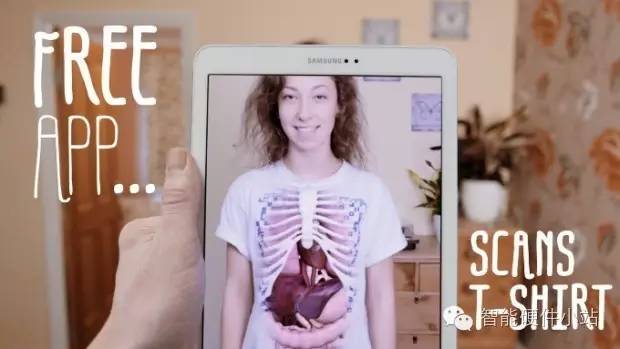然后呢,你只需用手机打开 T 恤配套的 App,朝着 T 恤上扫一扫。“活蹦乱跳”的五脏六腑就显示在你的手机屏幕里。