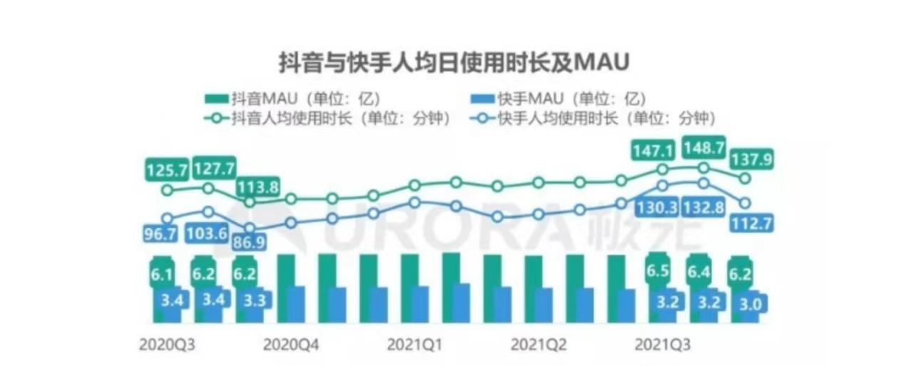 2021年6月,奥运前,快手的月活在3亿左右,抖音超过6亿,人均使用时长上,抖音以135.7分钟领先快手的112.2分钟;奥运开始后,7月与8月,快手和抖音的人均日使用时长分别涨至130分钟和147分钟以上;9月奥运会结束,快手的人均日使用时长快速回落至112.7分钟,落后抖音25分钟以上。