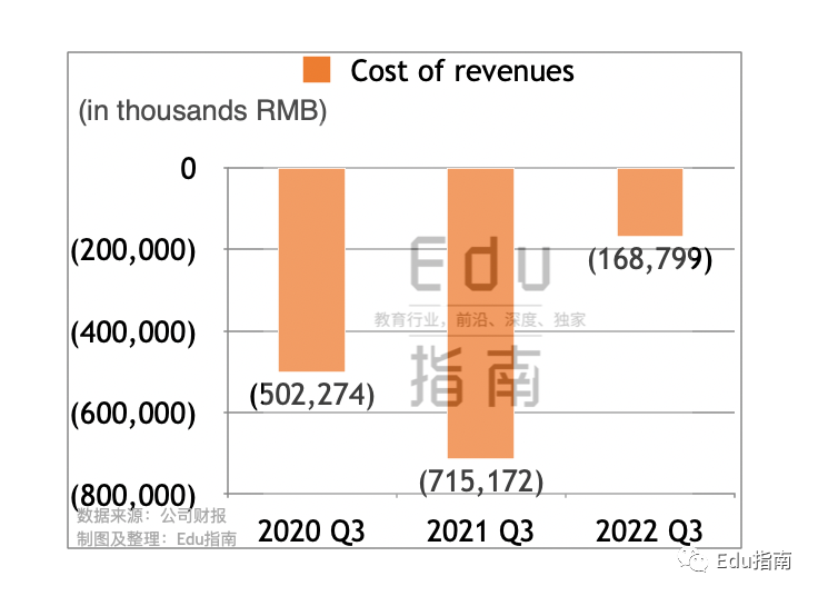 根据财报,高途公司Q3收入成本为1.7亿元,而上一财年同期收入成本为7.2亿元,本财季该项成本减少76%。2020财年Q3收入成本为5.0亿元,本财季相较同样表现为减少。季报称,收入成本下降的主要原因是业务重组之后员工和办公室减少, 导致员工费用、租金费用、教材和带宽成本减少。