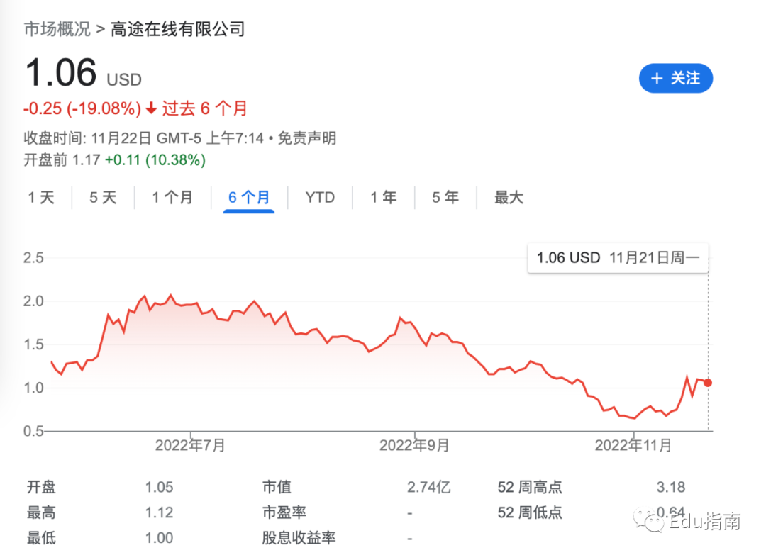 高途公司过去半年市值下跌19%,当前市值为2.7亿美元。