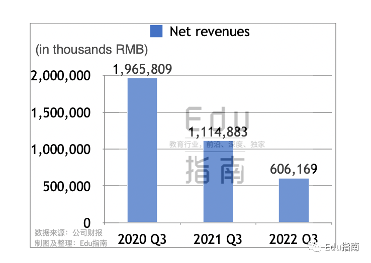 根据季报,高途公司Q3营收为6.1亿元,同比2021财年Q3的11.1亿元,本季度营收下降46%。该公司于2020财年Q3营收为19.7亿元,本季度相较下降幅度为69%。根据季报描述,营收下降主要是因为公司进行了组织调整和业务重组,包括停止向学生提供义务教育学科辅导服务等。