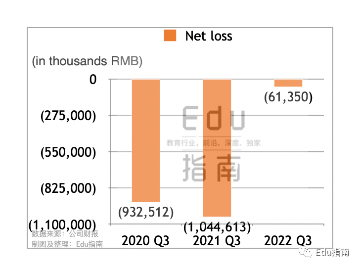 收入成本、总运营费用本财季均表现为下降的同时,高途公司Q3盈利状况表现为净亏损显著收缩。本财季净亏损0.6亿元,而2021财年Q3净亏损10.4亿元,更早之前的2020财年Q3净亏损9.3亿元。