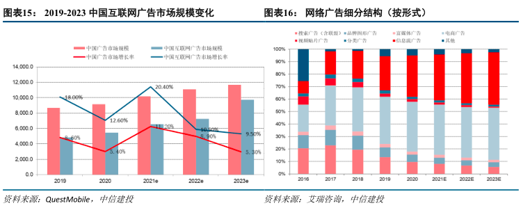 「2022年虽然受到疫情和监管两方面影响,短期增速下调,但环境趋于稳定、政策趋于完备之后长期仍然保持增长活力。」中信建投的研报中指出,2023年中国互联网广告市场规模仍将保持9.5%的增长,一方面互联网广告市场容量持续扩展,而另外一方面互联网广告的结构细分趋于精细化,尤其是电商广告和短视频广告占比持续上升。