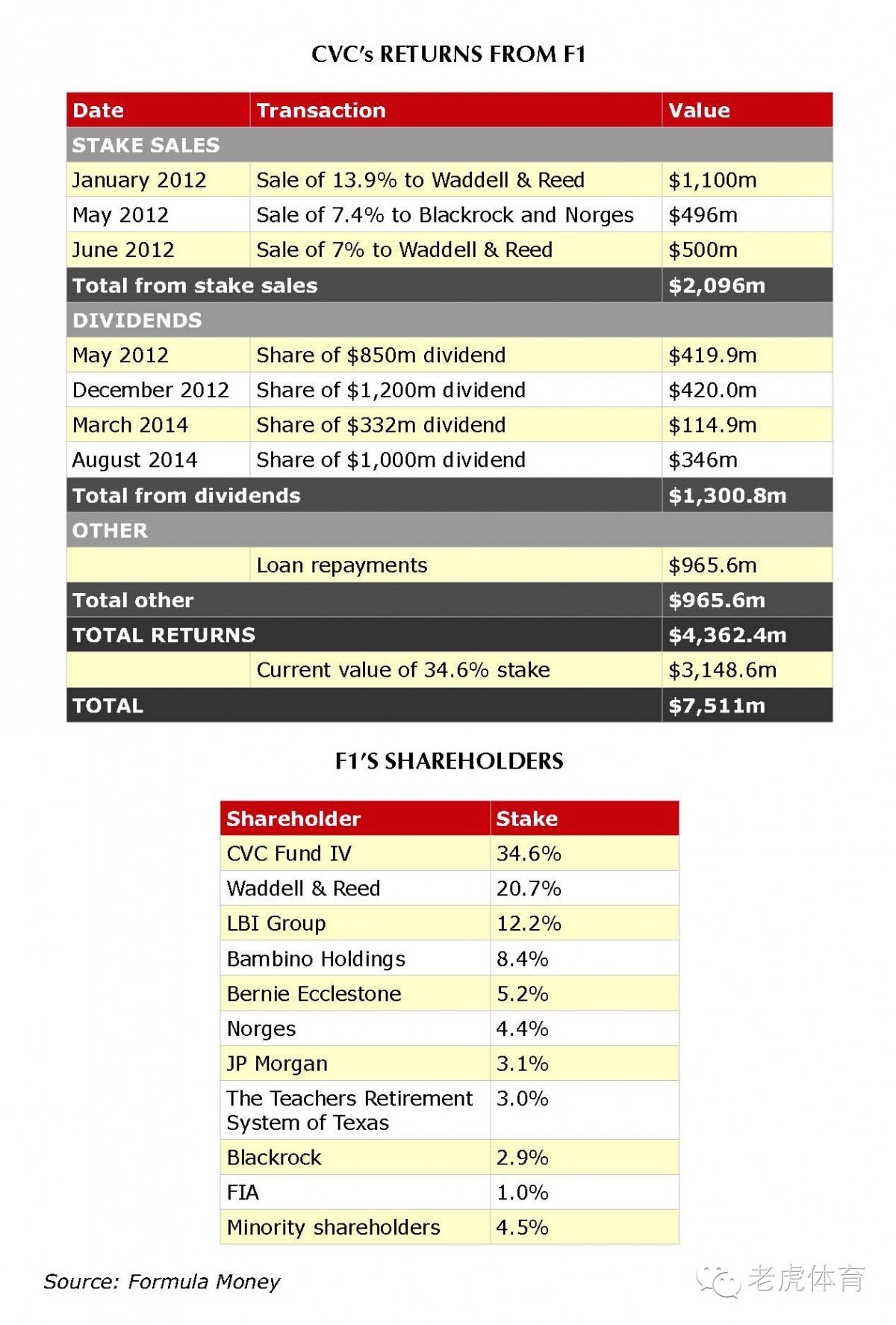 CVC资本(CVC Partner)拥有F1母公司Delta Topco 34.6%的股权,并且能够控制Delta Topco董事会。有趣的是,已经倒塌的投资银行----雷曼兄弟公司也是Delta Topco的股东之一,并且曾借出300万美元的贷款给F1的前股东。