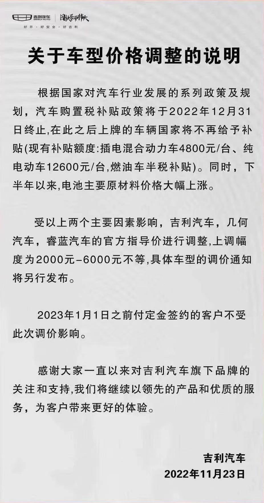 该说明称吉利因汽车购置税补贴政策终止与电池主要原材料价格大涨,将对旗下三大新能源品牌吉利汽车、几何汽车与睿蓝汽车进行官方指导价上调。上调幅度为2000元至6000元不等,具体车型的调价通知将另行发布,2023年1月1日之前付定金签约的客户不受此次调价影响。