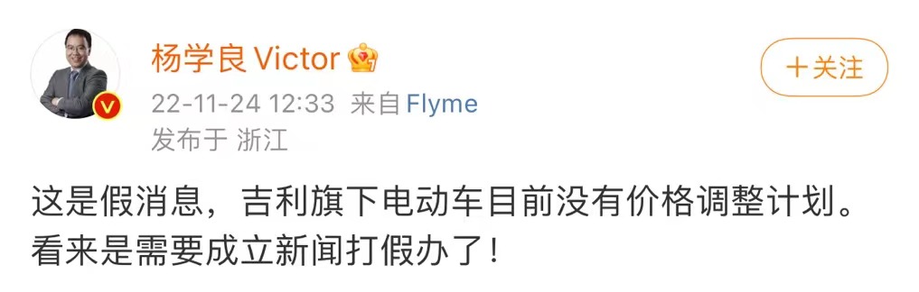 就在谣言传出的前一天,吉利旗下高端新能源品牌极氪副总裁赵昱辉就曾向外界表示,面对复杂的市场价格体系变化,极氪不会跟风做价格调整。