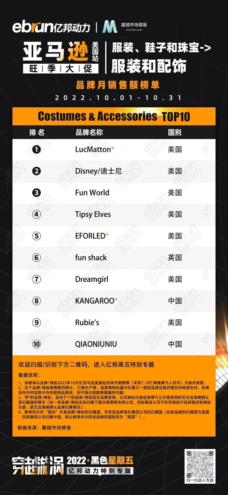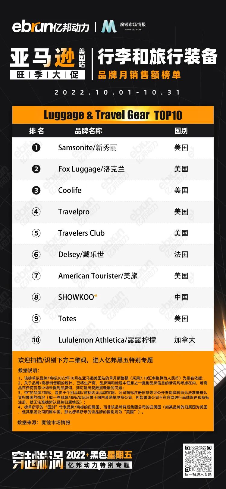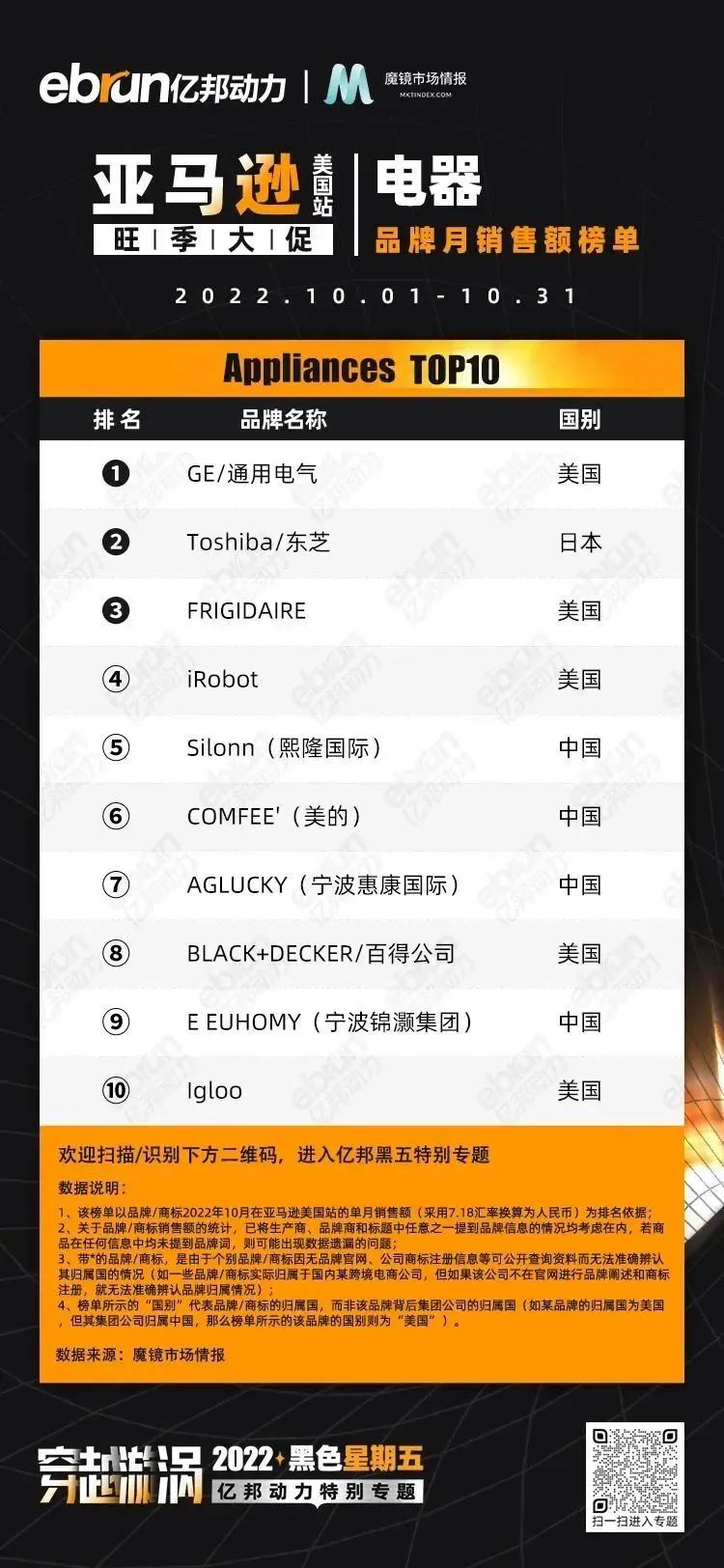 1、该榜单以品牌/商标2022年10月在亚马逊美国站的单月销售额(采用7.18汇率换算为人民币)为排名依据;