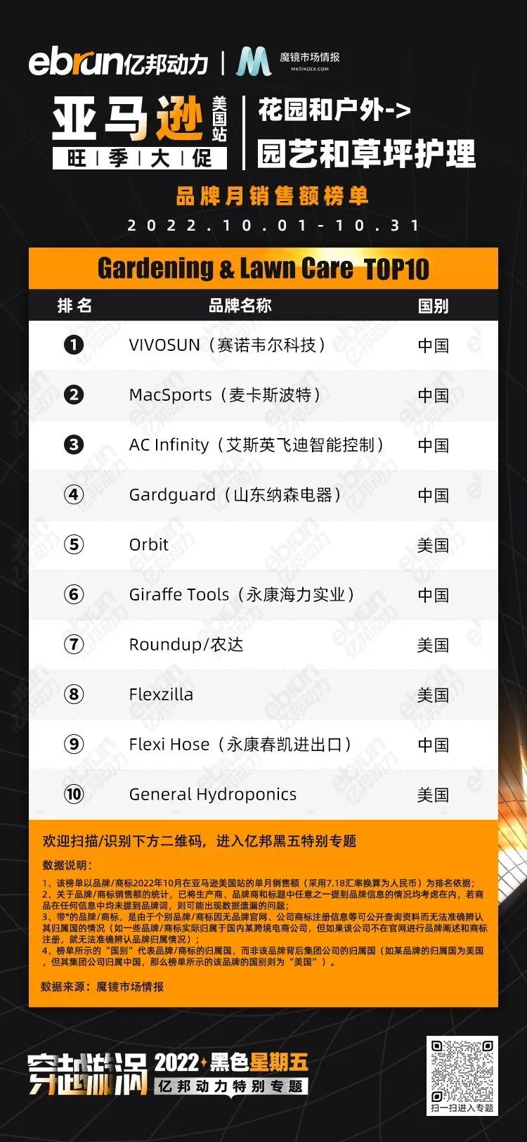 “花园与户外->园艺和草坪护理”类目则几乎是中国品牌的天下,中国品牌在TOP10榜单中共占据了6席,第1至第3名依次为来自VIVOSUN(赛诺韦尔科技有限公司)、MacSports(麦卡斯波特公司)、AC Infinity(艾斯英飞迪智能控制股份有限公司)。