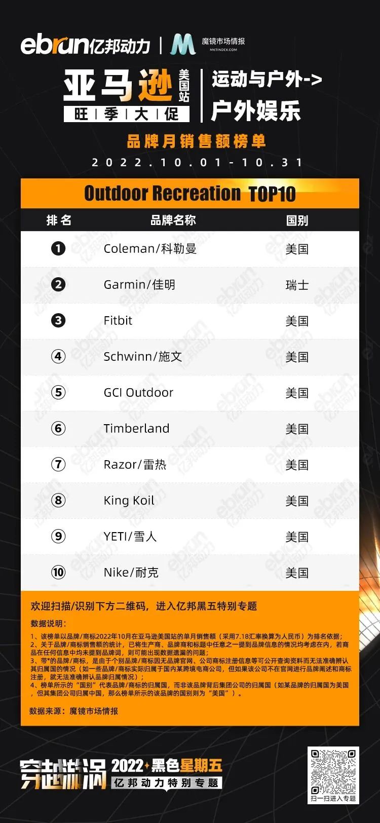 本周,旺季大促即将迎来黑五这一高潮节点,也意味着2022年行业大盘走势即将定格。根据“魔镜市场情报”对亚马逊美国站商家10月份的销售情况统计来看,各大类目的表现也出现明显差异。为展示今年旺季大促第一阶段(首月)商家们的表现,亿邦动力从电子/电器/科学 、运动/户外/出行、家居/美容/生活三大行业里选取了16个类目(含一级类目和二级类目),按照该类目下的品牌(或商标)在10月份的累计销售额制作出了TOP10榜单,供大家参考。