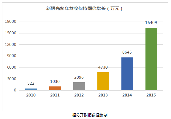 称新眼光为新三板明星公司并不夸张,从财务数据上看,新眼光的业绩成长相当漂亮,超过许多创业板公司。据有案可查的公开资料,从2010年至今,新眼光已经保持5年业绩翻倍增长的速度。高速的营收增长表明新眼光的业务模式具有广阔的发展空间。