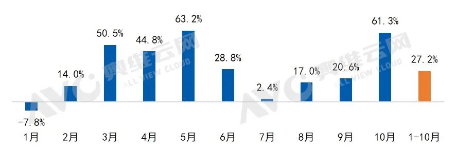 2022年1-10月中国彩电市场8K清晰度产品销量同比表现