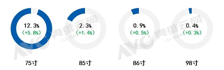 据奥维云网(AVC)全渠道推总数据显示,2022年1-10月,75寸及以上产品市场零售量份额达到了16.2%,较去年同期增长了8.0%,其中,75寸产品零售量占比达到12.3%,较去年同期增长5.8%,成为今年至今增长最多的尺寸。