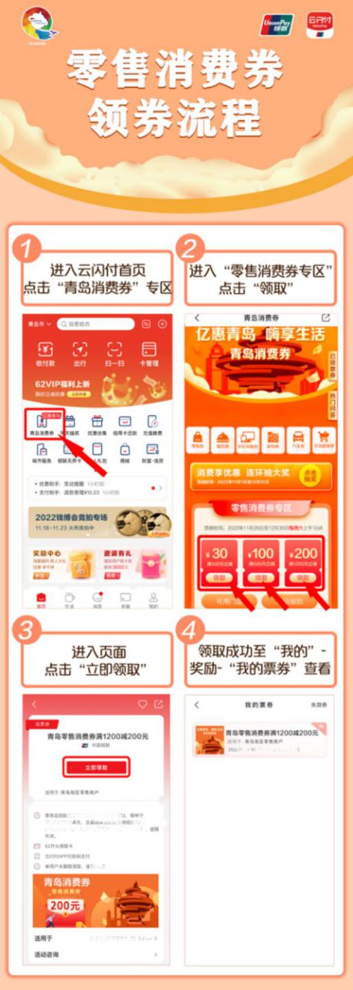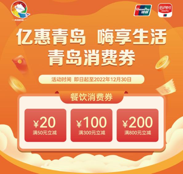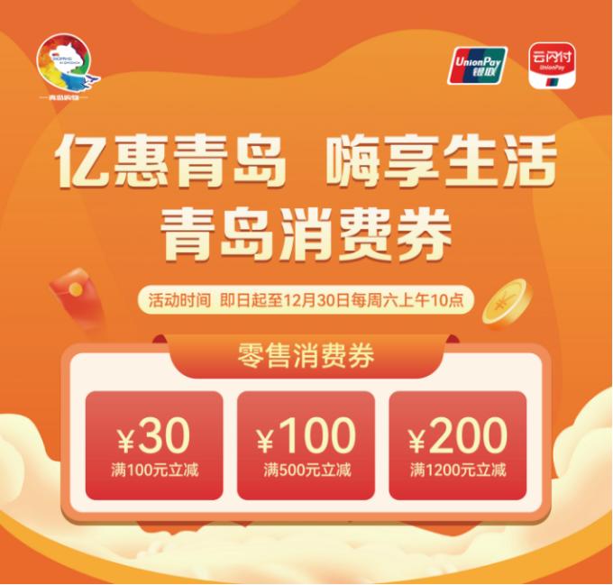 零售消费券自11月26日起,于每周六上午10点发放;餐饮消费券自11月26日起,于每周三、周六上午10点发放。两种消费券均通过银联云闪付APP“亿惠青岛 嗨享生活”青岛消费券专区录取。