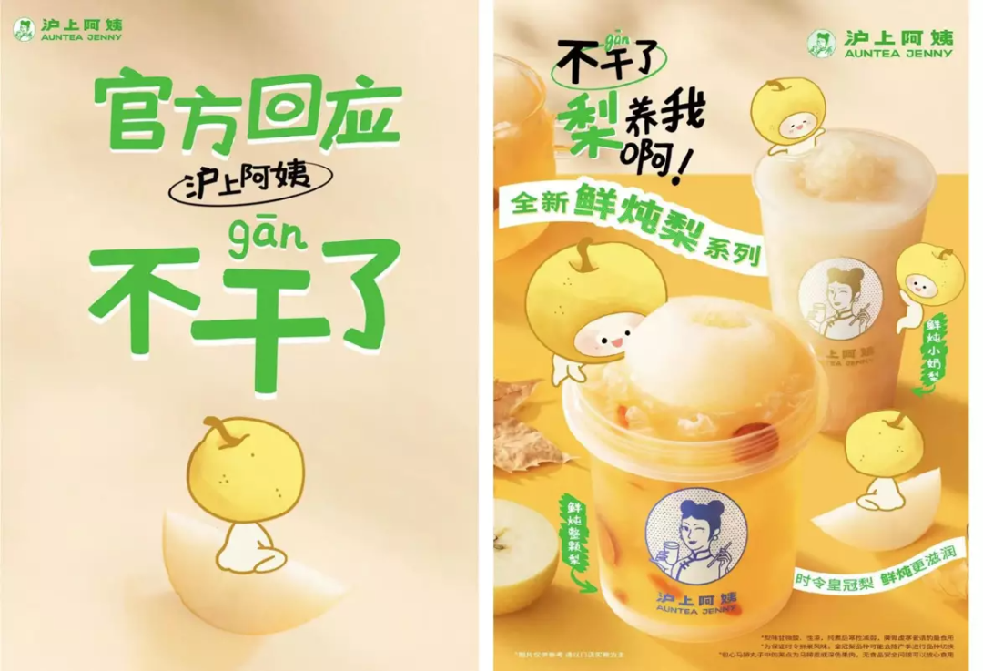 面对这波员工整顿职场“危机”,官方也迅速发了声明回应::”不是不干[gàn]了,而是不干[gān]了,因为有「梨」养我啊!”并揭秘了秋冬新品鲜炖梨,鲜梨慢炖,润喉润燥,非常符合传统的秋冬养生观念。