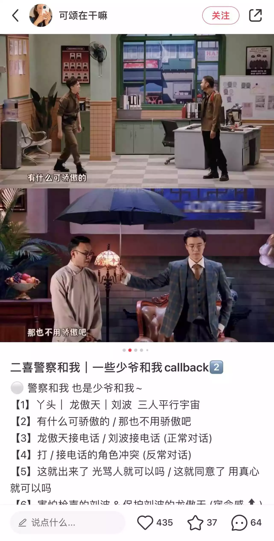 在《少爷和我》播出之后,两位演员又接连创作了《警察和我》《德古拉和我》两个后续作品,这种三部曲式的作品不仅延续了两位演员的人设和风格,增加了观众的熟悉感,也让许多粉丝都期待两个人能推出更多合作续作,发展成“傲天刘波er宇宙”。新作对前作的细节callback,也被观众们津津乐道,大家甚至会自发解读几个作品之间的关联。
