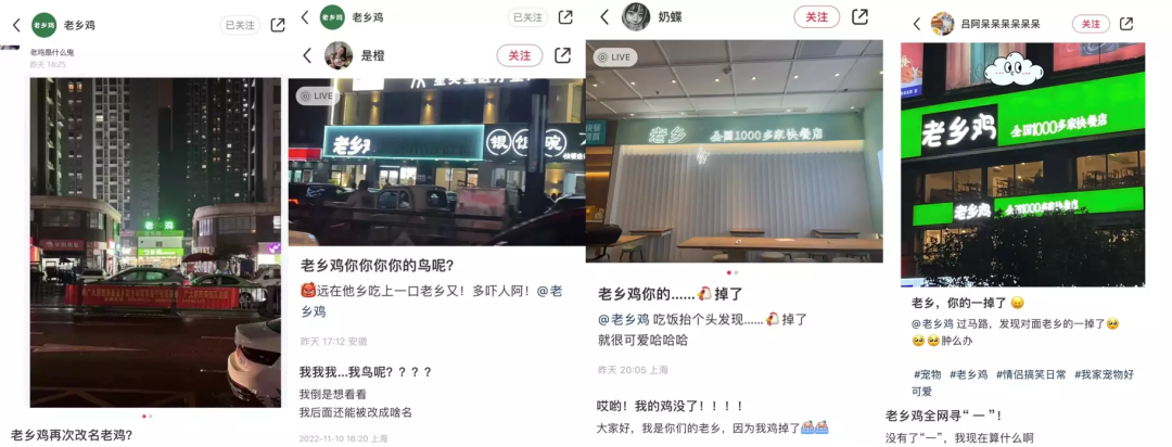 比如同样作为名里带动物的品牌,不仅盒马的“马”会乱跑,老乡鸡的“鸡”也会乱跑,因此老乡鸡时不时就能收到来自各地网友“不怀好意”的积极投稿,嘲笑老乡鸡又丢鸡了。