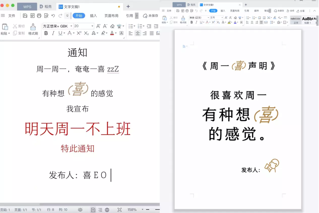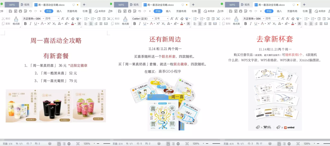 喜茶把打工人们内心汹涌的吐槽和“喜”字的发音相结合,化成一句“很喜欢周一,有种想(喜)的感觉”,包含果茶和奶茶的双杯联名套餐也被命名为“周一果真奶喜”。同时用谐音吐槽配合极致简洁的WPS直出画风生成联名活动海报,看似精神稳定地发到了喜茶的各个官方账号上。