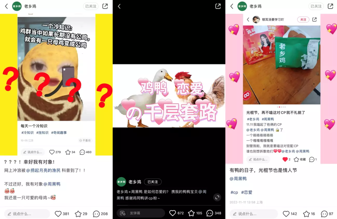 在之前的文章中,Foodaily就介绍了老乡鸡和周黑鸭的cp故事。“鸡同鸭讲CP”高调官宣之后,双方很是甜蜜了一阵子,日常官号互cue、翻牌cp粉剪的鸡鸭cp视频、甚至双十一还在秀恩爱。