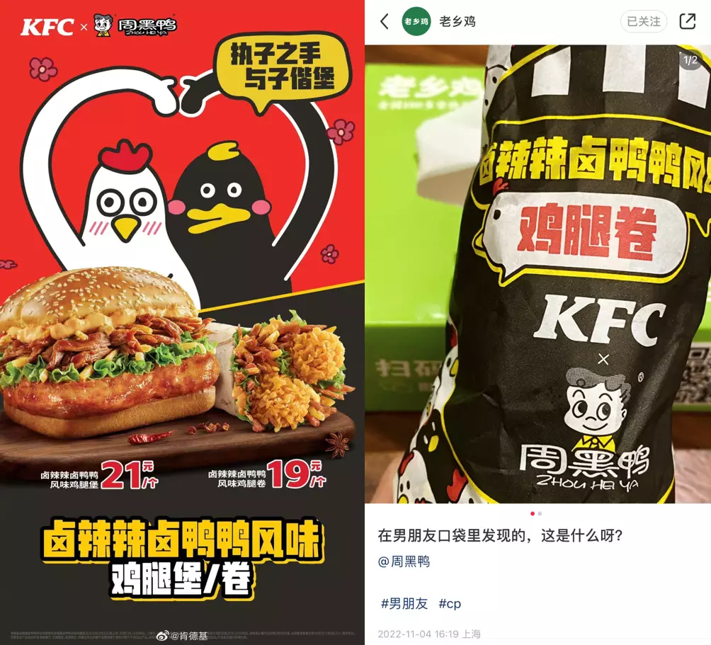 原来,是周黑鸭和肯德基“鸡鸭重逢”,卤辣辣卤鸭鸭风味鸡腿堡/卷二次联名回归。双方不光发联名新品、周边和表情包,还在官方微博发布诸如“执子之手,与子偕堡”“还是你和我对味”“好久不见,嘎嘎想念”“给每个鸡都配个鸭”等cp营业文案,并号召大家去肯德基门店见证鸡鸭的真香名场面。