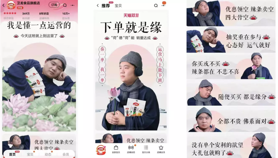 别人家的天猫店铺首页都是满屏的折扣信息,而在卫龙的店铺首页,运营本人手持莲花,怀抱辣条,面色平静,不悲不喜的cos起了知名佛系青年表情包,仿佛化缘一般,淡淡地来一句“你一单,我一单,运营马上能下班”,以单结缘。