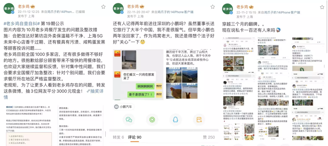 此外,还有突然关心两年前被送往深圳的合肥土鸡小鹏,翻牌网友三个月前发的老乡鸡相关微博表示要抽奖……互联网都不一定有的记忆,老乡鸡却都记得,出其不意的callback说来就来。